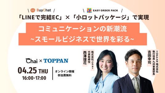株式会社Chai(東京都渋谷区、代表取締役社長:西澤理花)は「商品販売におけるコミュニケーション」をテーマにTOPPAN株式会社をお招きし、4/25(木)に無料オンラインセミナーを開催いたします。