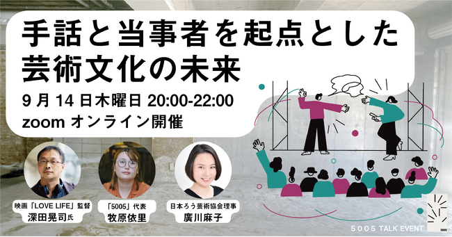 今回は、今秋に東京・西日暮里にオープンする手話文化を保存・体感するための新施設「5005」の第一弾企画として、映画『LOVE LIFE』の監督であり、映画における制作環境の改善に取り組まれている深田晃司監督をゲストに迎え、「5005」代表で日本ろう芸術協会代表理事の牧原依里と、同協会理事の廣川麻子とともに「手話、当事者を起点とした芸術文化の未来を支える共助システム」をテーマにトークイベントを開催いたします。