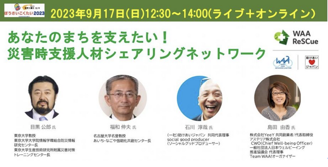 関東大震災から100年目にあたる2023年9月1日(金)にスタートした、WAA ReSCueの新しい災害支援人材のシェアリングネットワークをご紹介し、一緒に活動いただく自治体、企業、そして災害支援に関心のある個人の方々との仲間づくりを行います。