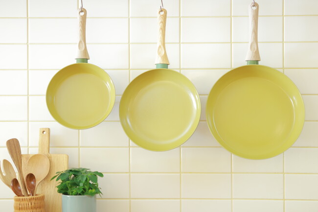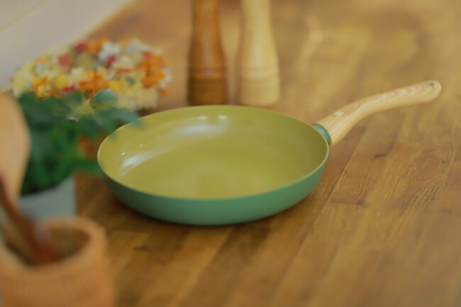 セラミックコーティングのフライパンは白色が多くありますが、白色が故に汚れが目立ちやすいというデメリットも。アムヴィーガンは明るいオリーブカラーで調理中の食材が見えやすいだけでなくキッチンや料理に彩りを与えてくれます。