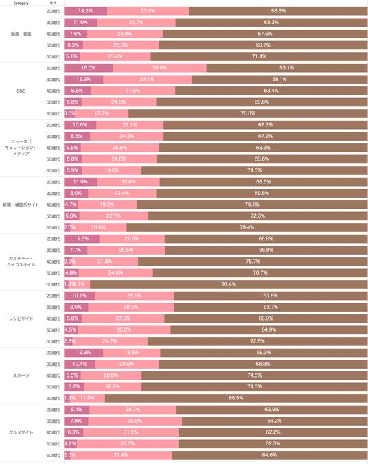 なお、「動画・音楽」「SNS」カテゴリ別以外の他6カテゴリ「ニュース(キュレーション)」「新聞・雑誌系」「カルチャー・ライフスタイル」「レシピ」「スポーツ」「グルメ」についても調査しており、その調査結果および考察もnoteに掲載しております。