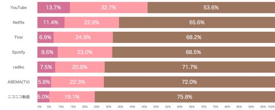 動画・音楽メディアのカテゴリに分類し、個別メディアごと(「TVer」「radiko」「Spotify」「Netflix」「ABEMA」「YouTube」「ニコニコ動画」)に、購入意向が高まるか否かを質問しました。