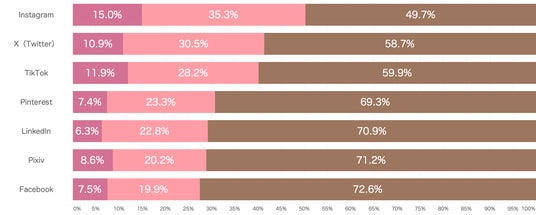 SNSメディアのカテゴリに分類し、個別メディアごと(「Instagram」「Pinterest」「LinkdIn」「X(Twitter)」「Facebook」「Pixiv」「TikTok」)にどの程度、購入(利用)意向が高まるかについて質問しました。