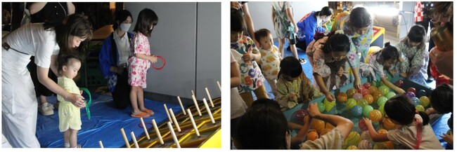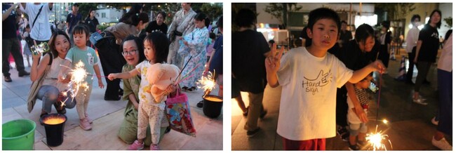また、富士見二丁目町会主催で「こども花火(手持ち花火体験)」が実施されました。最近ではなかなか手持ち花火を体験する場面も少なくなったのか少し慣れない手つきながらも、各々で楽しんでいる様子が見られました。縁日ブースでは輪投げとヨーヨー釣りを実施しました。行列が途絶えない盛り上がりを見せておりました。どのエリアも非常に子どもたちの熱気が強く感じられました。