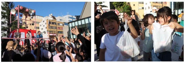 やぐらから会場に集まった子どもたちへのプレゼントとして株式会社JMの大竹社長より、お菓子まきがおこなわれました。袋に入ったたくさんのお菓子を手にした子どもたちからは満面の笑みが見られました。