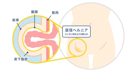 鼠径ヘルニアは、太ももの付け根(鼠径部)の筋肉に穴が開き、鼠径部の膨らみを認めるとともに、腸をはじめとした臓器が外に飛び出す病態を指します。