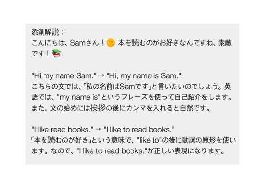 解説: 単に間違いを指摘するだけでなく、Emma先生はなぜそれが間違っていて、どうすれば改善できるかを詳しく説明します。これにより、ユーザーは同じ間違いを繰り返さず、自身の英語力を向上させるための理解を深めます。