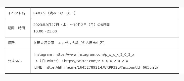 久屋大通公園南エリア賑わい創出実行委員会(構成企業:J.フロント都市開発株式会社、三菱地所株式会社、株式会社竹中工務店)は、名古屋市中区の久屋大通公園「エンゼル広場」において、今後の再整備に向けた「公園の新しい可能性」を発明するイベントの第2弾「PAXX?」(読み:ぴーえー)を、2023年9月27日(水)~10月2日(月)の6日間実施します。