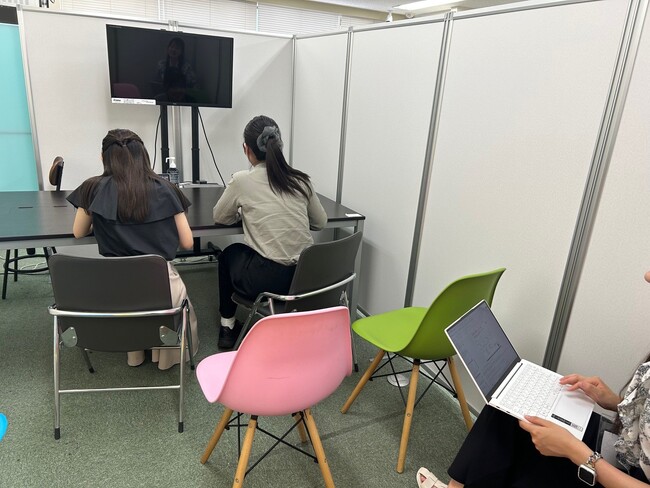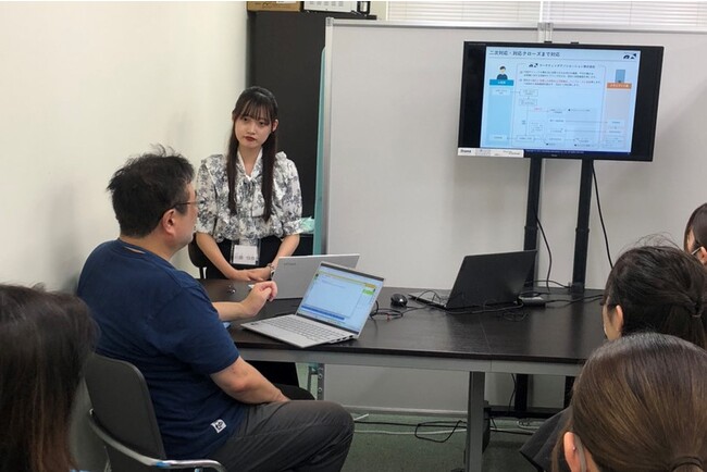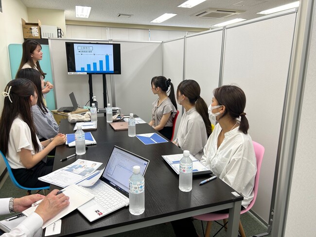 インターンシップでは、2日程合計で7名の学生を招き、「ECサポロジPlus」の魅力を見出し、新たな提案方法を共創していきました。初日は当社の会議スペースにて、当社の会社説明、営業社員が研修で使用している教材の視聴、営業社員2名の営業提案実演を受けました。
