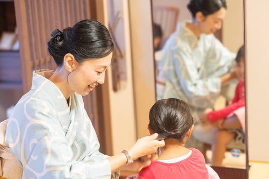 髪を結って、着物に着替えて。まずは身だしなみを整えて、若女将・若旦那に変身します。