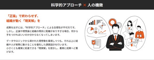もう一つの特徴は、「科学的アプローチ」と「人の機微」を両立させることです。データやロジックから導かれる理想像は重要ですが、組織が実際に動けなければ成果にはつながりません。マグナリープは、正論や理想論だけで終わらせず、現場の制約、意思決定の構造、担当者の納得感まで踏まえ、実行可能な優先順位と小さな前進の積み重ねを設計します。