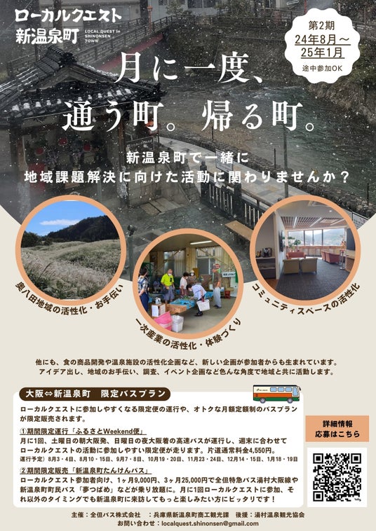 全但バス株式会社(本社:兵庫県養父市、代表取締役社長 村上宣人)は、このたび、観光庁の実証事業「『第2のふるさとづくりプロジェクト』ターゲットニーズに着目した再来訪促進のためのモデル実証事業」の採択を受け(※1)、地域活性化に向けた企画・イベント開催を通じて、新たなファンを創出するためのプログラム「新温泉町ローカルクエストvol.2」を展開します。当社が観光庁の『第2のふるさとづくりプロジェクト』の採択を受けるのは、2023年度に続き、2度目となります。
