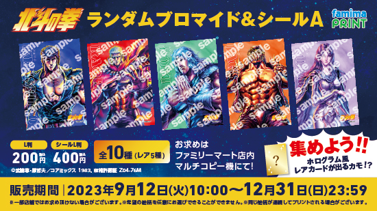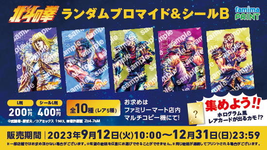 アールビー・フーズ株式会社(本社:東京都港区、代表取締役:秋元之浩)は、連載開始から40周年を迎える人気漫画「北斗の拳」の限定デザインブロマイドを、2023年9月12日(火)から全国のファミリーマート店内マルチコピー機 「ファミマプリント」にて販売開始いたします。