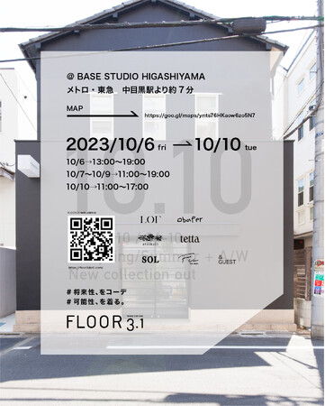 FLOOR3.1 のグランドオープンを10/10 に迎えます。10/6 金曜日から10火曜日まで中目黒BASE STUDIO HIGASHIYAMAにて展示会を開催いたします。出展ブランドの実際の服、デザインを見ることのできる機会になります。また、作り手のデザイナーと直接対話できます。