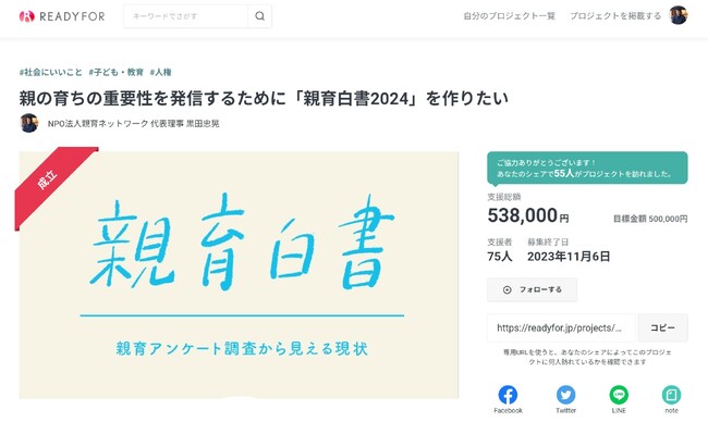 そして、この調査結果を発信するために「親育白書2024」を作成したく、「親の育ちの重要性を発信するために「親育白書2024」を作りたい」というテーマで、クラウドファンディングを9月18日(月)から11月6日(月)まで行いましたが、想いに共感頂いた皆さまから、目標額を上回るご支援を賜りました。