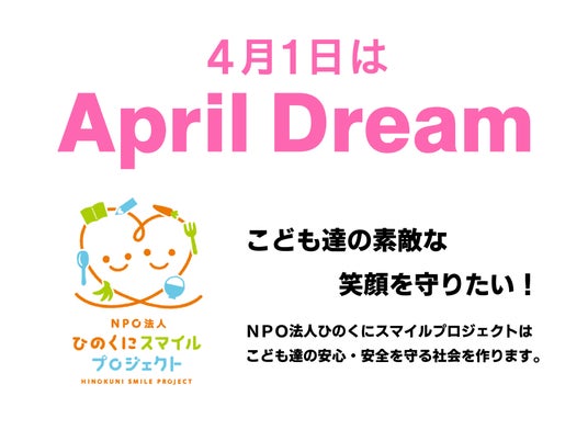 NPO法人ひのくにスマイルプロジェクトは、4月1日に夢を発信する日にしようとするApril Dreamに賛同しています。このプレスリリースは当団体の夢です。