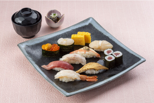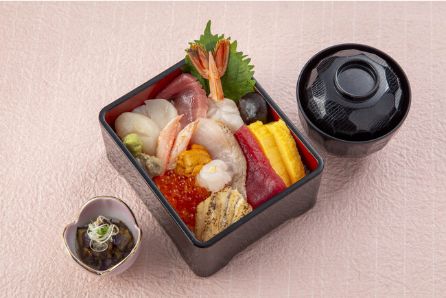 メニューは、金沢まいもん寿司が得意とする人気ネタを網羅した寿司盛り合わせセット(小鉢、お椀付き)4種類(1,650円~3,630円)や海鮮丼セット(小鉢、お椀付き)4種類(1,650円~3,800円)いずれも税込。中でも寿司盛り合わせ「舞紋」や海鮮丼「金澤」では、白身の王様のど黒や富山湾の宝石と称される白えびなどが味わえます。その他、加賀棒茶などの飲み物数種をご用意。