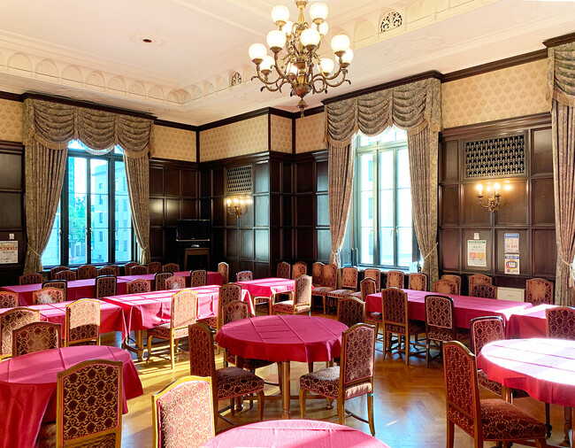 国会議事堂の建築資材は日本全国から集めた最高品質のものを使用、当時の最も優れた技術で造られ、素晴らしい装飾が至る所に施されています。日本の歴史がつくられてきた場所に相応しい厳かな雰囲気です。寿司部門フロアの卓には金沢まいもん寿司のイメージカラーの一つである赤いテーブルクロスを掛けております。