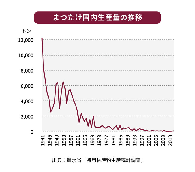 長い時間をかけて人々が自然と寄り添いながらつくりあげてきた里山が、まつたけが育つ好環境でしたが、里山が荒れてしまったことが主な原因で収穫量が大幅に減少しています。