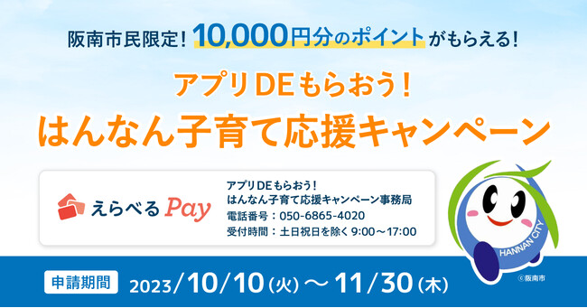 大阪府阪南市(市長:水野 謙二 以下:阪南市)は、マイナンバーカードを活用した「アプリDEもらおう!はんなん子育て応援キャンペーン」を〔令和5年10月10日(火)から11月30日(木)〕までの期間で実施いたします。