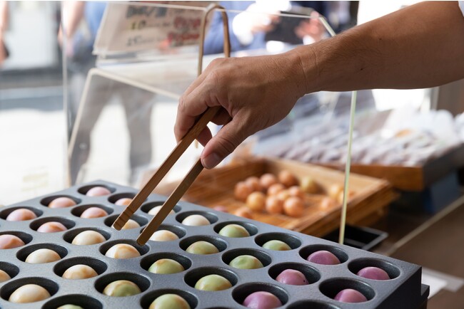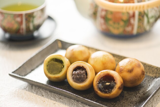 毎月1日に限定販売している「まるもち家」の3色セットが登場。これまで催事などのイベントで年間11万個の販売実績がある元祖名物商品です。外側はパリッ、中身はもっちりと食感にこだわりながら、お餅と中の素材のバランスを絶妙に調合した和菓子になります。