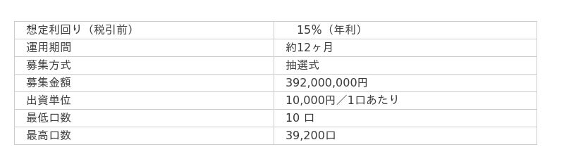 (注)本ファンド表示の想定利回りは、1年間運用した場合の数字です。実際の運用期間によって、分配金額は異なる点にご留意ください。また、土地を順調に取得できなかった場合や順調に売却できなかった場合には、元本の返金や元本毀損、想定利回りを下回るなどのリスクもあります。想定運用期間に対象不動産の売却が完了しなかった場合は、運用期間を延長する可能性があります。