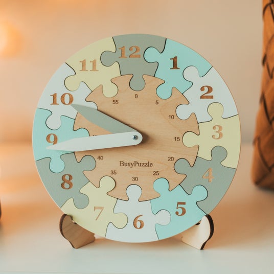 木製の時計のパズルです。文字盤がパズルのピースとなっており、長針と短針を自由に動かすことができます。