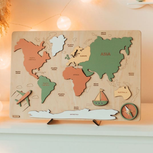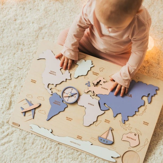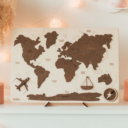 木製の世界地図パズルです。大陸がパズルのパーツとなっており、遊びながら地理を学ぶことができます。