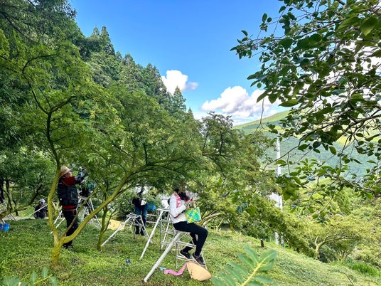 そこで、当施設にご宿泊いただいたお客さまを山椒畑まで送迎し、朝から夕方まで援農ボランティアに携わっていただくパッケージ“ぶどう山椒収穫レスキュー”を行いました。すでに収穫作業も後半を迎えており急遽募集した企画でしたが、スタッフの“繋がり”も功を奏しのべ30名の方にご参加いただきました(翌2024年には首都圏や京阪神からのべ80名が参加)。企画前は「こんな真夏の暑い時期に、しかも無償で手伝ってくれる神様みたいな人なんておるか!?」といった農家さんの声も聞こえてきましたが(弊社も半信半疑でしたので当然です)、終わってみれば、受入農家も参加者もお互いに笑顔になれる企画となりました。