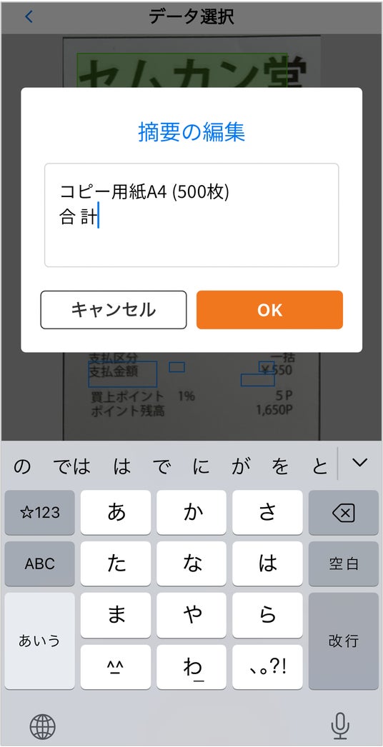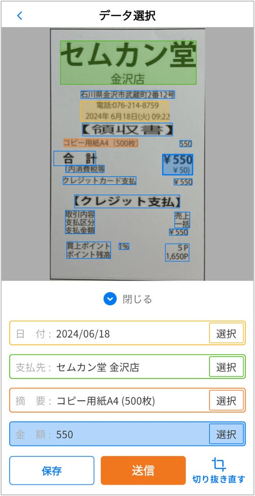 最新のAI技術を利用して、印字された領収書の金額、日付、支払先などの記載箇所をそれぞれ指でタッチすることで自動的に読み取ります。また、読み取りがうまく機能しなかった場合でも、その場で簡単に修正できます。