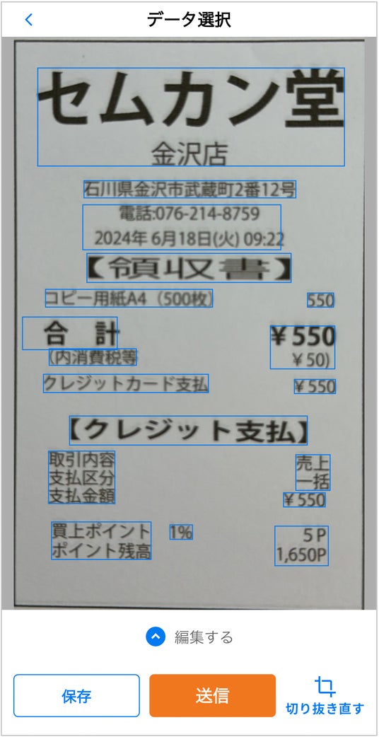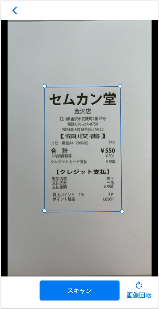 領収書画像をスキャンすると、対象領域が青線四角で囲まれます