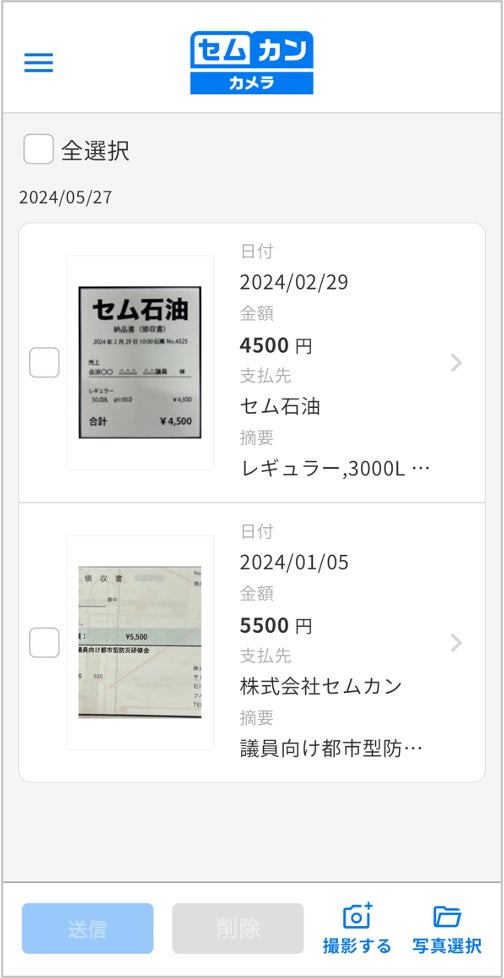カメラアプリで上記手順2.から4.まで操作した後は、セムカンSaaSにログインして「セムカンカメラから読み取る」ボタンから情報を取り込みます。書類作成に必要な残りの項目はセムカンSaaSで入力します。