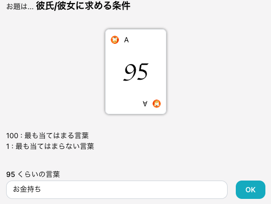 各プレイヤーは数字を確認し、数字の強度に合わせてお題に対する回答を考える