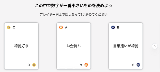 議論のゴールは、参加者全員で最も数字の小さいプレイヤーを決めることです。最も数字の小さいプレイヤーを1人予想したあと、全員の数字を見て答え合わせをします。