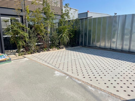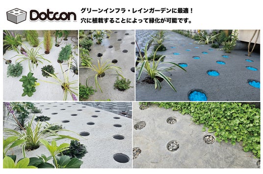 穴に植栽を施すことで、レインガーデン・グリーンインフラへの活用でき、都市部の緑化や自然環境の保護に寄与する「呼吸する地盤面」を現場打ちコンクリートで実現。環境意識が高まる中、この点も非常に高く評価されています。