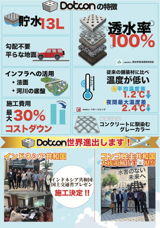 グッドデザイン2024の受賞と東京都のアンバサダー認定を受け、「Dotcon」は今後さらに多くの市場での展開を予定しています。すでに、インドネシアでの施工が決定しており、世界的に市場を広げていく計画が進行中です。雨水しみこみ技術を通じて、環境保護に取り組み続ける「Dotcon」は、『私たちの生活は維持』+『地球の持つ本来の機能』を活かし今後も革新的な技術と持続可能な都市開発に貢献していくことでしょう。