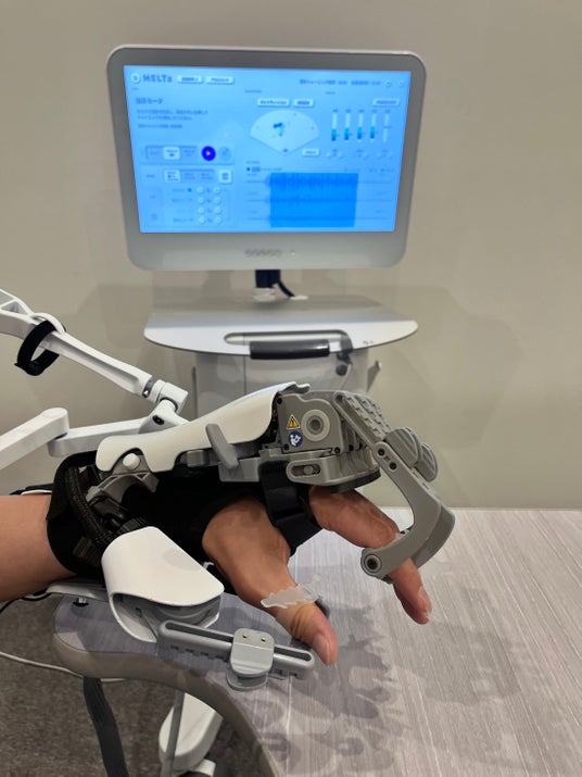 MELTz(メルツ)は手指の運動機能回復に特化したロボットリハビリテーション機器です。AIが筋肉の電気信号を分析し、患者さんが行おうとしている動きを認識することでスムーズな手指の運動をロボットによってアシストします。