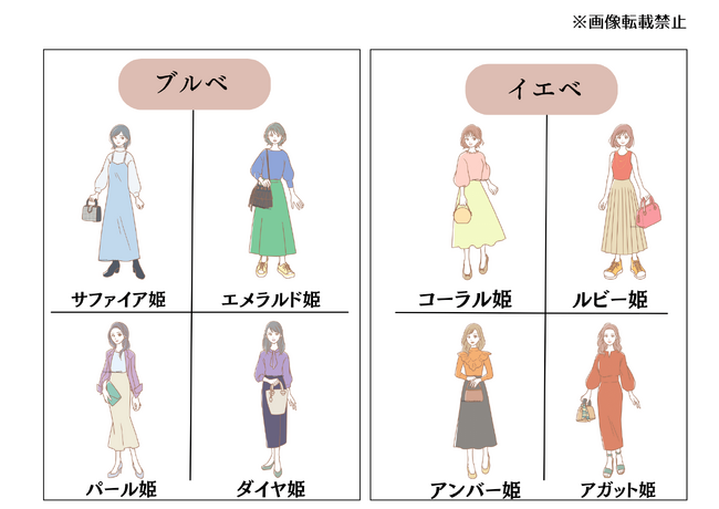「似合う色」「骨格」「あなたの印象」を掛け合わせて8タイプに分類したのがプリンセスタイプ診断です。