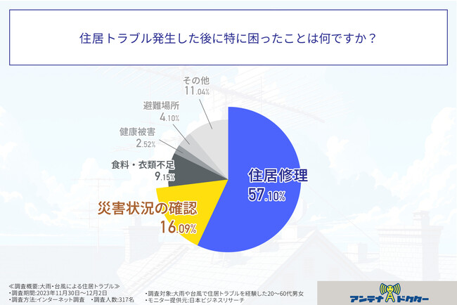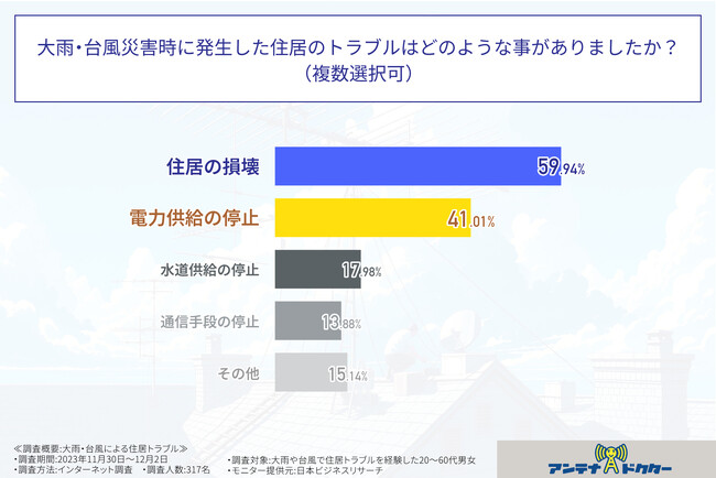 アンテナドクター(本社:奈良県奈良市、代表取締役:松田 陽平)は、この度、台風などで住居トラブルを経験した20~60代男女317人を対象に、大雨・台風による住居トラブルに関する調査を実施いたしましたので、お知らせいたします。