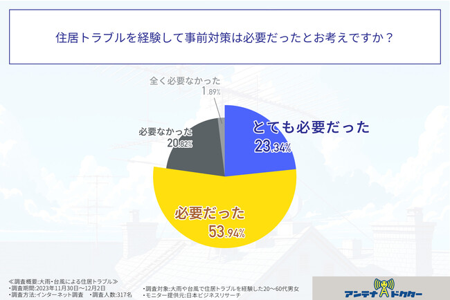 そこで、アンテナドクター(URL:https://antenna-dr.com/)は、大雨や台風で住居トラブルを経験した20~60代男女に対し、具体的なトラブル内容や事前対策の必要性などについて意識調査を実施しました。