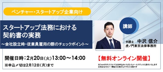 スタートアップ法務における契約書の実務~会社設立時・従業員雇用の際のチェックポイント~虎ノ門東京法律事務所弁護士 中沢信介は、2月20日(火)13時より、エンジェル・シード期のスタートアップ企業様・経営者の方向けにセミナーを開催いたします。