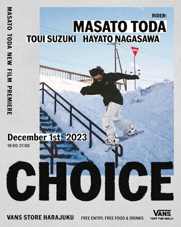 本キャンペーンのキックオフイベントとして、VANS SNOWBOARD TEAM RIDER 戸田真人の最新フィルムの試写会を2023年12月1日(金)にVANS STORE HARAJUKUで開催します。