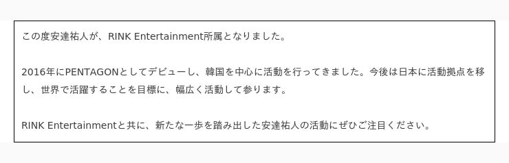 安達祐人はCUBE Entertainmentとの専属契約が満了し、RINK Entertainmentとの専属契約を結んだ。