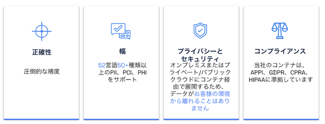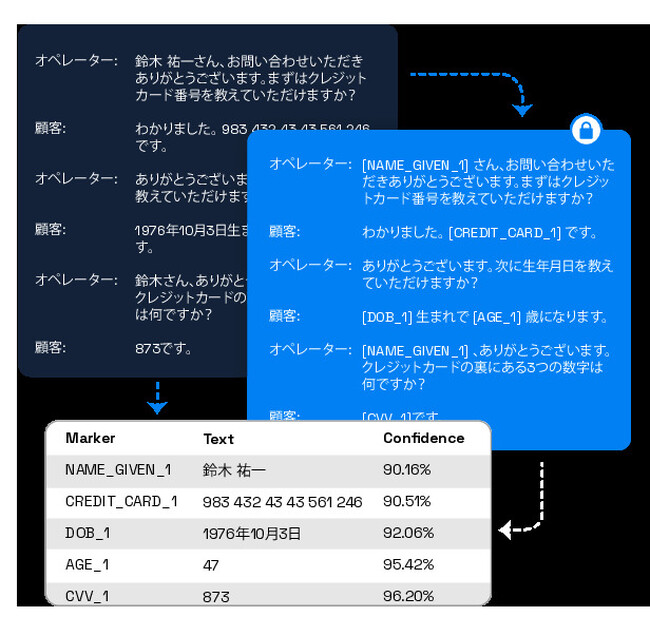 Private AIは、ユーザーが大規模言語モデル(LLM)に情報を入力する際、また自社データを使ってモデルのファインチューニングをする際に、独自の機械学習アルゴリズムを活用して機密情報や個人を特定できる情報(以下PII)を自動的に編集し、データプライバシーを確保したAIの利用を可能にするサービスを提供しています。このサービスは、日本語を含む52か国の言語に対応し、50以上のデータ種別に対応しています。特筆すべきは、単なるルールベースではなく、大量のデータでトレーニングされたAIによってPIIを検出しており、その精度が非常に高い点です。さらに、Private AIはPIIだけでなく、個人保健情報(PHI)やクレジット情報(PCI)など、高度な機密性を要する情報にも対応しています。また、日本独自のデータ種別(マイナンバーや日本の住所など)にも対応しています。これにより、国際的かつ多岐にわたる利用環境で、高いデータプライバシーを確保しながらAIテクノロジーの恩恵を最大限に享受できる点がPrivate AIの強みとなっています。
