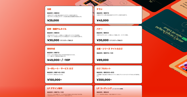 ※名刺、チラシ、バナー、サムネイル、資料作成、企画・シリーズタイトルロゴ、コーポレート・サービスロゴ、LP、ホームページ制作までの範囲を継続的にデザイン支援するプランです。