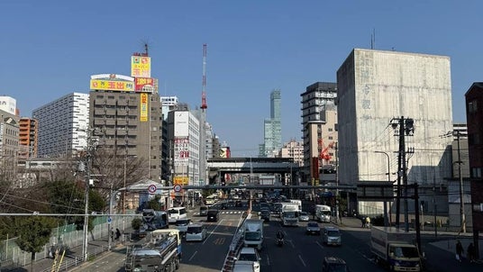 大阪・西成区で撮影された主要幹線道路の風景(2025年3月撮影)。この街では、外国人労働者によるインフラ整備の現場が至る所に点在している