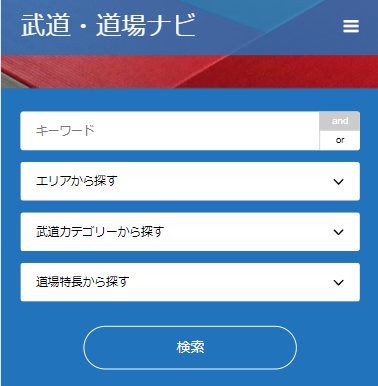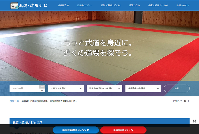 武道・道場ナビは全国の武道道場が検索でき、武道に馴染みのない人にもっと武道を身近に感じてもらうためのマッチングサイトです。