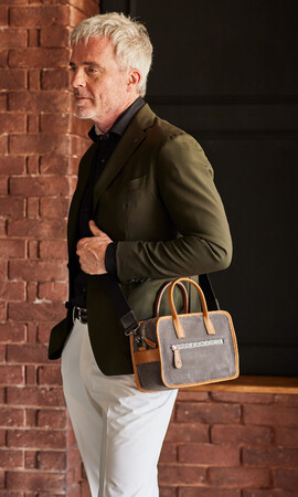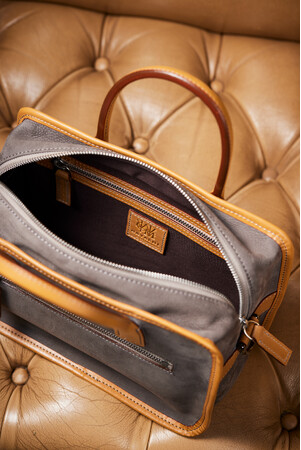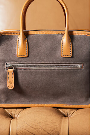 ボディのヌバックレザーと英国オークバークレザーの組み合わせがお洒落な外装。細かい部分まで丁寧に仕立てています。硬派なビジネス鞄の熟練工が仕立てる事により、お洒落な雰囲気がありながらも、その鞄が手仕事で作られている事が伝わっていきます。男に似合うショルダーボストンとしてショルダーは黒色に、金具も黒色にしてシックに引き締まっています。