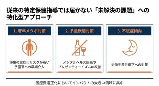 「若年メタボ・多量飲酒・不眠症傾向」など、従来の特定保健指導では届かなかった課題に特化。成果連動型(PFS)にて費用対効果を最大化し、データヘルス計画を推進。
