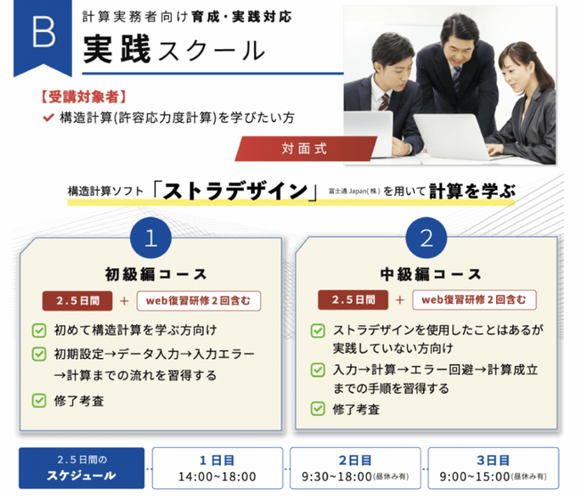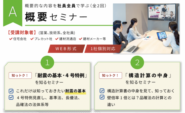本講座には営業・技術系・全社員を対象とする「概要セミナー」と構造計算を学びたい方を対象とする「実践スクール」を設けており、全社員で対策を行うことが可能です。